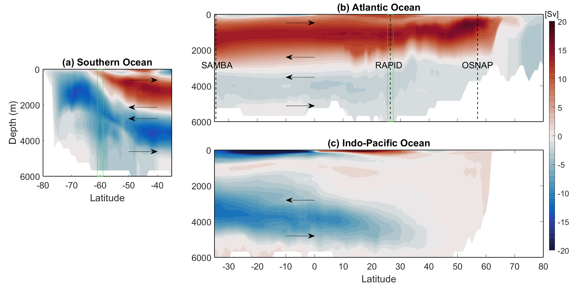 The ocean’s meridional overturning circulation (MOC) is a key component of the climate system, transferring mass, heat and chemical tracers between all of the major ocean basins. However, direct measurements of the MOC remain confined to a few locations in the Atlantic (see figure below). A possible means of circumventing these observational limitations is to utilize satellite-based measurements, for example of sea surface height, and ocean bottom pressure, to indirectly observe MOC variability. To date such efforts have focused on the latitude of the established observational arrays in the Atlantic.