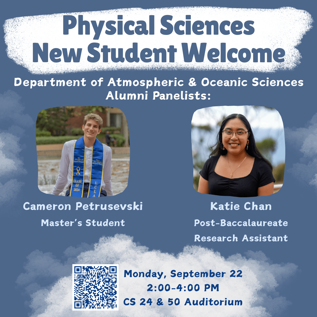 Wondering what your AOS journey at UCLA and beyond might look like? Join us at the Physical Sciences New Student Welcome on September 22, from 2-4 pm in CS 24 and 50. Hear from our panel of AOS graduates and connect with faculty and fellow students as you begin your path in the Physical Sciences!