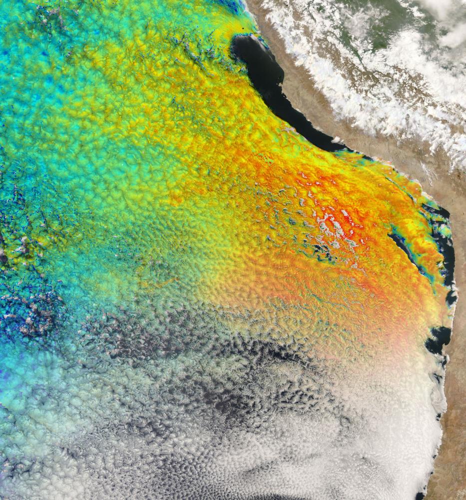 The image shows two MODIS-Aqua products for October 17th 2008 over the persistent Southeast Pacific stratocumulus deck, off the coasts of Chile and Peru. The background is a true color image of the clouds at 250 m resolution, with an iridescent overlay showing a 1km resolution cloud droplet number (Nd) retrieval for the same overpass. Red, green and blue colors show high (~1000 #/cm3), medium (~100 #/cm3) and low (~10 #/cm3) Nd values. The east to west Nd gradient is produced mainly by anthropogenic aerosols, which influence cloud properties. We have shown that applying these retrievals in a data assimilation framework can help improve model estimates of below-cloud aerosol, allowing the observing system to “see aerosols” even under cloudy conditions. For details refer to our PNAS paper.