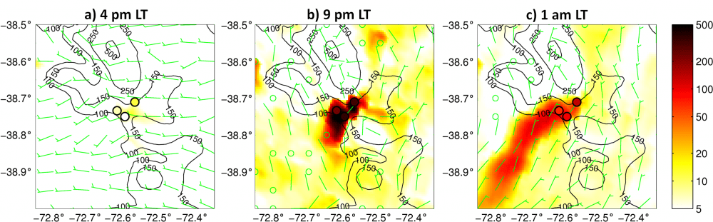 The figure above shows an example of an episode unfolding in the city of Temuco, Chile, as a combination of stagnant conditions and intense emissions due to wood burning stoves for heating which in only 5 hours are able to rise particulate matter concentrations by over an order of magnitude and then slowly decrease overnight. The circles represent the air quality stations, while the color map the model prediction, which in this case was able to properly represent the episode.Windbarbs and topography are also represented in the figure.